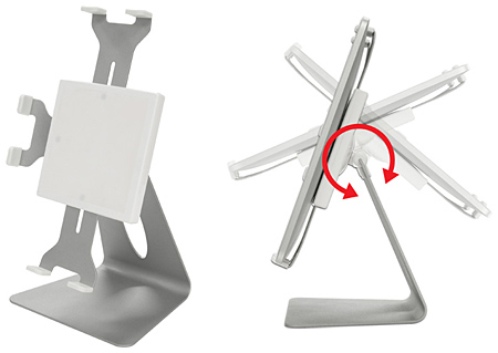 操作性を損なうことなく、デスク上で使いやすい角度に固定できるスチール製スタンド。iPadをはじめ、縦横いずれかの幅が185~250mmのスレート型端末・タブレットPC・電子書籍リーダーなどに対応する。ホルダー部は横方向に360度、縦方向は約330度回転する。アーム部にはシリコンラバーを採用し、取り付けたデバイスを傷めずに確実に保持する。