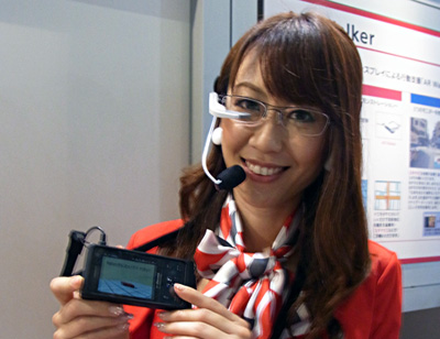 「AR Walker」は、携帯電話のGPS機能と小型のヘッドマウントディスプレイを組み合わせ、視覚的にさまざまな情報をリアルタイムで取得できるもの。ブースでのデモでは、携帯電話に接続したヘッドマウントディスプレイを装着すると、NTTドコモのキャラクター「ドコモダケ」が実空間上に浮かんで現れて、実際の風景の映像に合わせて曲がる方向や目的地などをナビゲーションしてくれる。