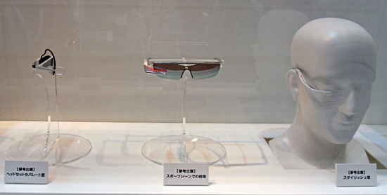 デザインバリエーションも参考展示。スポーツシーンを想定したモデルは、ランニング時に時間や距離、コース情報をなどを提供する。ヘッドセットセパレート型は、美術館のガイドとしての使用も想定しているという。将来は、ヘッドマウントディスプレイと携帯電話を、Bluetoothなどを利用して無線で接続することも検討している。