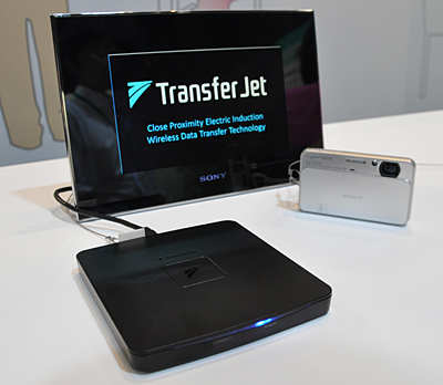 「TransferJet」は、対応端末同士の距離数cmで写真や動画などのコンテンツを伝送する近接無線転送技術。ブースでは、TransferJetに対応するコンパクトデジタルカメラからPCやテレビ、プリンタ、デジタルフォトフレームにデータを伝送する操作を体感できる。PC以外のTransferJet非対応の機器には、専用の読み取り端末を接続する必要がある。