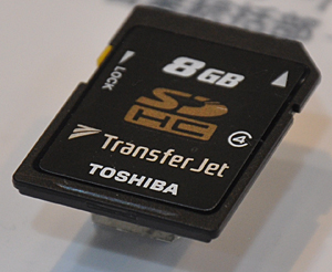 今後、TransferJetの普及の一助になると期待されているのが、今回参考出品している東芝が開発中のSDカード。端末自体にTransferJetのLSI(集積回路)を組み込まなくても、SDカードを挿入すれば端末で近接伝送ができるようになる。製品化は2011年10月以降の予定で、容量は未定。ブースの担当者は、「SDカードの価格が500円以下になれば普及する」と、意外に冷静だ。