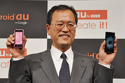 KDDIの田中孝司代表取締役執行役員専務は、「Skypeの知名度を上げて、その価値を提供していきたい」と語った。また、スマートフォンの今後の展開として「今回の発表は『IS03』に続く第2弾。第3弾は今秋に予定しており、ここで発表した端末で、新しい価値を提供していきたい。デザインで他社と差異化を図る」と意気込みを語った。