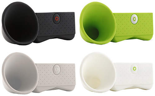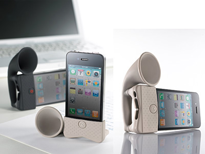 ユニークなホーン型デザインを採用した電源不要のiPhone 4専用スピーカー兼スタンド。iPhone 4を縦横どちらの向きでもセットでき、ドックコネクタケーブルをつなげたまま使用することもできる。コンパクトサイズながら、ホーンを通すことで音を大きく増幅し、パワフルな音を再生する。