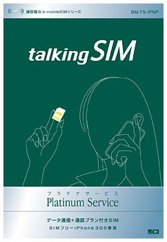「talkingSIMプラチナサービス」は、NTTドコモのFOMAネットワークを利用して通信できるSIMフリー版のiPhone 3GS用SIMカードと、データ通信・通話プランのセット。基本料金は月額6260円。データ通信は使い放題の定額制で、1050円分の音声通話料金(国内通話で最大25分相当)が含まれる。超過通話料は21円/30秒。初期手数料は3150円。ソフトバンクモバイルの回線では禁止されているテザリングに対応する。