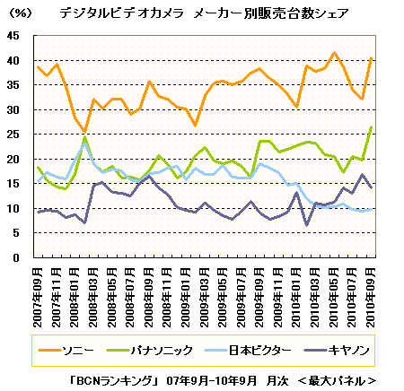 9月、パナソニックがデジタルビデオカメラで、直近の3年間(2007年9月-2010年9月)で過去最高のシェアを獲得した。「BCNランキング」では、メーカー別販売台数でシェア40.4%で1位のソニーに続き、シェア26.4%と3位以下を大きく引き離している。ビデオカメラといえば長年ソニーの独走状態が続いてきたが、なぜ今、パナソニックの製品が売れているのだろうか。