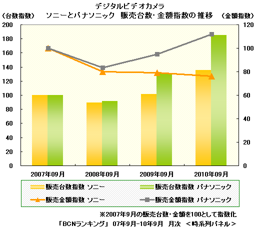 ここで、メーカーシェア1位のソニーと2位のパナソニックの動きを比較しよう。1年のうち、運動会のシーズンでビデオカメラが最も売れる9月のデータを年ごとにピックアップした。3年前の07年9月の販売台数・金額を100とした指数で、販売台数は、ソニーは08年9月に89.1と落ち込むが、09年9月は101.2、10年9月には135.3と好調。対するパナソニックは、08年9月は91.8だったが、09年9月で130.6まで拡大し、10年9月は185.2と3年前の2倍近くまで迫る勢いだ。