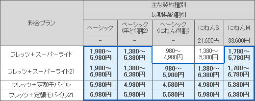 月額料金は、完全定額プラン「フレッツ+定額モバイル」のベーシックが5980円、2年間の継続利用が条件のベーシック(にねん得割)が4580円。二段階定額プラン「フレッツ+スーパーライト21」のベーシックが1980-6980円、ベーシック(にねん得割)が980-5980円。完全定額プラン「フレッツ+定額モバイル21」のベーシックが6980円、ベーシック(にねん得割)が5580円。