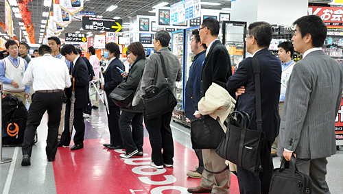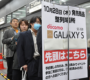イベントには、イメージキャラクターの堀北真希さんと、CMで擬人化したスマートフォンとして登場しているダース・ベイダーがゲストで登場し、全員でテープカット。会場は大いに盛り上がった。店舗の入口では、「GALAXY S」の発売を待っている幅広い年齢層の男性陣が行列。開店後には、「GALAXY S」の売り場にある専用カウンターで購入手続きを行っていた。