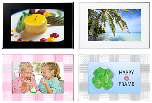 いずれも、画面には消費電力の少ないLEDバックライト液晶パネルを採用。16種類のスライドショーに対応する。メモリカードスロットのほか、2GBの内蔵メモリを備える。対応ファイル形式は、写真がJPEG、音楽がMP3とWMA、動画がMotionJPEG。スピーカーの出力は約0.5W×2。縦と横、どちらの向きでも設置できる。