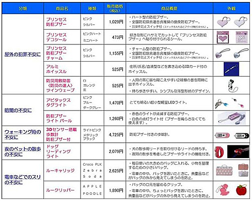 警備のプロの視点から、女性の生活に潜むリスクを分析。暴漢、強盗、ひったくり、すり、痴漢など、屋外でのリスクに対応するグッズを揃えた。アクセサリ感覚のハート型防犯ブザーや、防犯ブザー付きのピンクの歩数計など、女性目線で選んだデザインの商品を提供する。