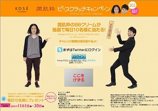 「ピースクラッチキャンペーン」は、キャンペーンサイト(http://pscratch.com/)にアクセスし、Twitterにログインした上でスクラッチを削ると、その場で抽選を行い、当選者に「潤肌粋 うるおいリフト BBクリーム」をプレゼントする。