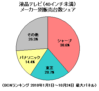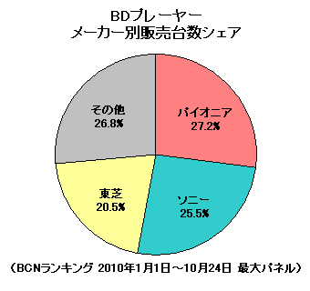各社の競争は、まさにデッドヒートの様相を呈している。2010年1月1日から10月24日までのシェアは、1位がパイオニア、2位がソニー、3位が東芝。1位と2位の差は、わずか1.7ポイントだ。台数がはける年末商戦を控え、まだまだ勝負の行方が分からない状況である。