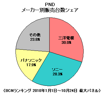 クルマにカーナビがあるのが当たり前になったいま、小型・軽量で手軽に持ち運べるナビとして人気なのが、PND(ポータブル・ナビゲーション・デバイス)だ。車内でカーナビとして使うだけでなく、車外に持ち出して使うシーンが増えている。家でドライブコースを調べたり、徒歩モードに切り替えて散策に使ったりするなど、用途は広い。1位は三洋電機でシェア30.0%。ただし、2位のソニーが28.3%にまで迫っている。年末商戦に向けて、鼻差の勝負が続きそうだ。