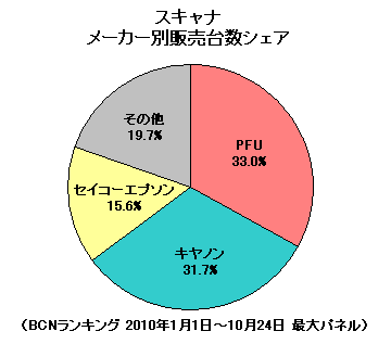 アップルの「iPad」を皮切りに、メーカー各社が力を入れ始めたスレート。電子書籍リーダーとしても期待されるデバイスの登場で、にわかに注目を集めているのが、紙の本をスキャナで読み込んで、自分で電子書籍をつくってしまう「自炊」だ。自炊に不可欠な道具、スキャナの1位は、PFUが堅持。大量の紙を一度に読み取るのに適した「シートフィード型」が自炊に適していることで、ユーザーを増やしている。ただし、2位のキヤノンとは1.3ポイントと僅差で、今後のシェア争いに注目だ。