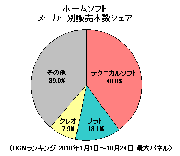 2008年からの世界不況で、給料の大幅減やボーナスカットなど、多くの国民がダメージを受けた。今年に入ってからは明るさが戻りつつあるが、先行きの不透明感は拭いきれない。堅実な生活の基本は、ムダを省くこと。使ったお金の管理をきっちりと行わなければならない。それを支えてくれるのが「ホームソフト」だ。トップはテクニカルソフトで、シェア40.0%。ソフト市場が成熟期に入っているにもかかわらず、堅調に販売を伸ばしている。忘年会やお歳暮など、何かと出るものがかさむ年末に向けて、ホームソフトのユーザーが増えることにも期待がかかる。(BCN・佐相彰彦)