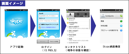 専用アプリケーション「Skype au」は、11月下旬以降に発売予定のシャープ製スマートフォン「IS03」を皮切りに、標準搭載していく。2011年以降、スマートフォンだけでなく、通常の携帯電話にもSkypeを導入する予定。