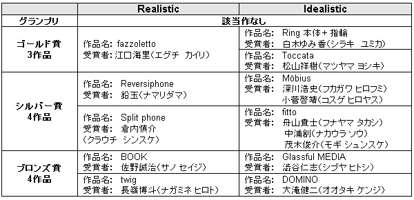 厳正な審査の結果、賞金50万円のゴールド賞は、「Realistic部門」で江口海里さんの「fazzoletto」、「Idealistic部門」で白木ゆみ香さんの「Ring 本体+指輪」と松山祥樹さんの「Toccata」が受賞。