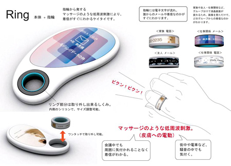 「Idealistic部門」でゴールド賞を受賞した白木ゆみ香さんの「Ring 本体+指輪」は、携帯電話本体と指輪で構成、人間の「触覚」に焦点をあて、指輪から発するマッサージのような低周波刺激によって、街中や電車などの騒音のなかでも、会議中でも、周囲に気づかれることなく着信がわかる。指輪の液晶画面には、電子文字が流れ、誰からのメールや着信なのかがすぐにわかる。指輪で着信を確認したあと、2度叩くと受信するので、あわてることなくカバンから携帯電話本体を取り出すことができる。