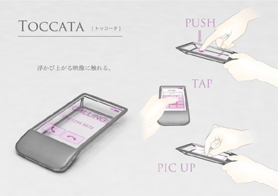 同じく「Idealistic部門」でゴールド賞を受賞した松山祥樹さんの「Toccata」は、フレームで構成する立体空間内に映像を投影し、そこに指を入れ、浮かび上がる映像に直接触れて操作する携帯電話。押し込む、叩く、つまむなどの動きによって、新しい操作性や喜び、感動が生まれる。フレームにあえて従来の携帯電話形状の輪郭とその記号性を残すことで、片手での操作性や握り心地、受け入れやすさをもちあわせた、未来の携帯電話を提案している。