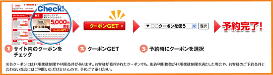 「楽天トラベル」サイトで、使いたい施設の「クーポンGET」ボタンを押すか、メルマガで案内するURLをクリックすることで、クーポンを取得できる。宿泊施設が独自条件のクーポンを発行するのは、旅行サイトで初めて。
