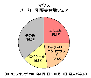 メーカーや家電量販店にとって、デジタル機器との「ついで買い」やリピーターを増やす商材としてポイントになっているマウス。エレコムが25.1%と、4分の1以上のシェアでトップを獲得している。ノートPCやネットブックなどモバイル用途や、オフィスや自宅などでの「快適な使用感」を求めて、複数製品を購入している人も多い。そんなニーズにマッチした製品が、市場制覇のカギになる。