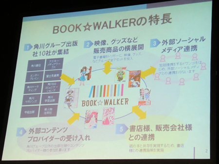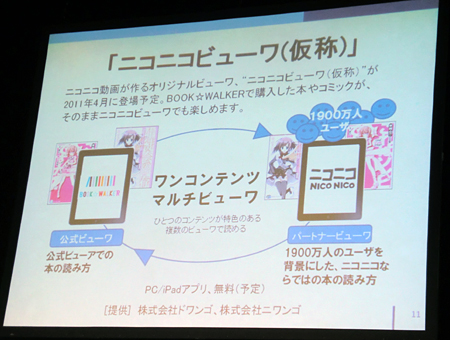 11月12日から14日まで、秋葉原UDXで開催する「電子書籍・コミックサミット in 秋葉原」の会場で行われた発表会では、作品のラインアップととともに、他の電子書籍プラットフォームとは一線を画した「映像、グッズなど販売商品の横展開」「外部ソーシャルメディア連携」「書店・販売会社との連携」などの独自の特徴を改めて強調。2011年4月リリース予定の「ニコニコビューア(仮称)」や「涼宮ハルヒのBook☆Walkerナビ」も紹介し、ワンコンテンツ・マルチビューアの考えを示した。