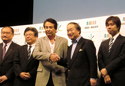 (左から角川コンテンツゲートの浜村弘一社長、角川グループホールディングスの佐藤辰男社長、小説家の大沢在昌氏、角川グループホールディングス 取締役会長の角川歴彦氏、角川コンテンツゲート 常務取締役の安本洋一氏)