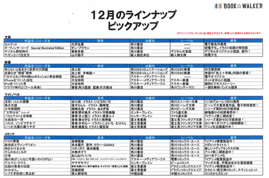 角川グループホールディングス傘下の角川コンテンツゲートは、12月に予定している「Book☆Walker」のiPad/iPhone向けアプリのリリース時に提供する電子書籍のラインアップを発表した。