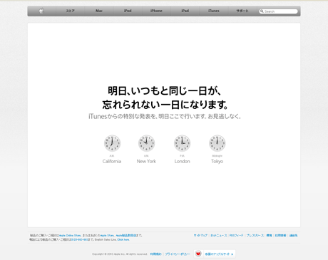 アップルは、「iTunesからの特別な発表」を、11月16日24時(17日0時)にウェブサイト上で行う。トップページとiTunesの紹介ページには、「明日、いつもと同じ一日が、忘れられない一日なります。」というメッセージとともに、時計と地名(カリフォルニア、ニューユーク、ロンドン、東京)が表示されており、日本、アメリカ、イギリスの3か国で同時に発表するようだ。