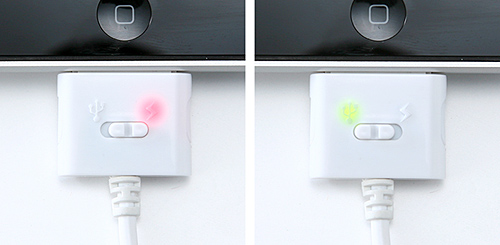 iPad/iPhone/iPodの充電・同期に対応。充電時は赤色、同期(iPhone/iPodは充電+同期)時はグリーンのランプが点灯する