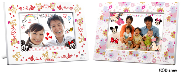 デジタルフォトフレーム「S-Frame DPF-E710」のディズニーキャラクターモデルは、ホワイトをベースにディズニーキャラクターをプリントした着せ替えパネルが付属する。デザインは「LOVELOVE」と「FLOWER」の2種類。