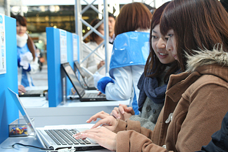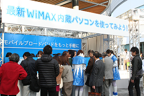 タッチ&トライコーナーでは、WiMAX内蔵のノートPCを実際に操作することができる。アンケートに答えた後、福引をしてはずれた場合は「WiMAX」のロゴ付きランチボックスがもらえる。若い女性やカップルなど、多くの来場者でコーナーは賑わった。