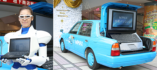 ユニークな展示物も。会場内を歩いているWiMAX内蔵PCを体の一部に組み込んだヒト型ロボット「ヒューマノイド」に話しかければ、WiMAXの紹介をしてくれる。また、クルマのトランクをノートPCに見立てたオブジェは、ブルーでなかなかキュートだ。