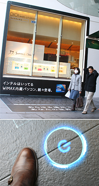 さらに、駅前広場に面した有楽町イトシアのビル一階には、WiMAX内蔵のノートPCに見立てたショーウィンドウが現れた。このノートPC、キーボードを踏んでも(押しても)残念ながら操作できないのでご用心。さながらアートの見本市だ。