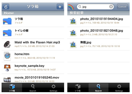「ソラ箱 for iPhone」は、iPhoneからウェブ上の自分専用のHDD内のファイルの閲覧やアップロード/ダウンロードを行うことができる。WindowsやMac OS、Linuxなど、異なるシステムを併用する環境で、このアプリを使ってファイルを共有・同期することができる。