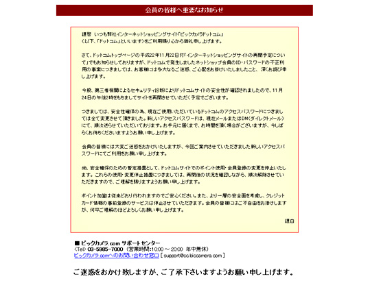 「ビックカメラ.com」では、11月13日に、ネットショップ会員の一部のID・パスワードが不正に使用され、うち20件で会員のネットポイントで商品が購入されていたことが発覚。ビックカメラは、ただちに「ビックカメラ.com」のすべてのポイント利用を停止し、同日24時にサイトを閉鎖する措置をとった。