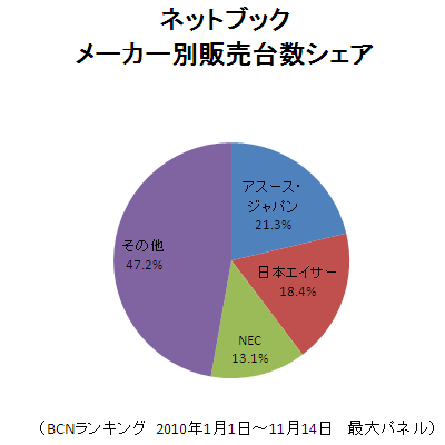 アスース・ジャパンと日本エイサーの台湾メーカーがシェア争いを続けているネットブック部門。累積シェアでは、アスースが21.3%でトップを維持し、エイサーが18.4%の2位だった。前週までは、アスースが21.3%、エイサーが18.3%。アスースのシェアに変化がない一方で、エイサーが0.1ポイント伸ばしている。逆転の可能性も含め、あと1か月の戦いから目が離せない。
