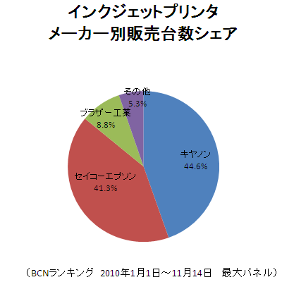 年末年始は、年賀状の作成の必需品、プリンタの特需期だ。インクジェットプリンタ部門は、キヤノンとセイコーエプソンの2強時代が続いている。累積シェアは、トップのキャノンが44.6%、2位のエプソンが41.3%という状況で、前週からほとんど数字は動いていない。均衡状態はこのままなのか。
