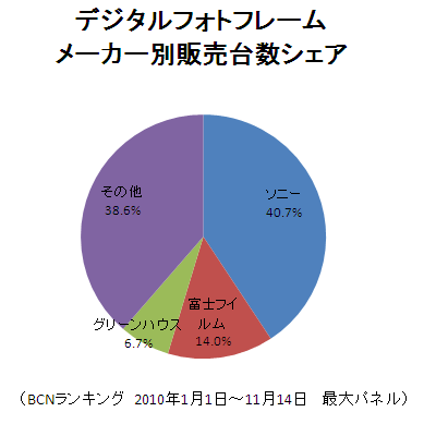 デジタルフォトフレーム部門は、ソニーが40.7%のシェアを確保し、14.0%で2位の富士フイルムを大きく引き離し、トップを維持している。ただし、10月にはパナソニックがiPod/iPhone対応機を引っさげて参入。今後は、シェア争いが激化する可能性がある。