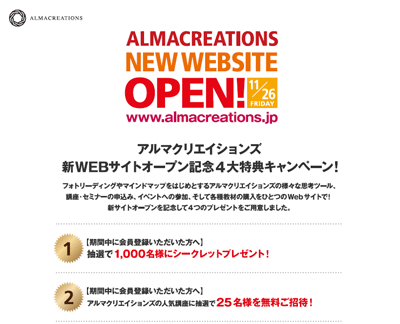 フォトリーディングやマインドマップの講座などを提供しているALMACREATIONS(アルマクリエイションズ)は、11月26日、より使いやすく、便利なサービスを提供するため、新しいウェブサイト「ALMACREATIONS ONLINE」をオープンした。