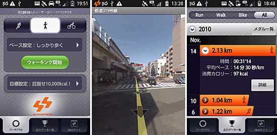 「au Smart Sports Run&Walk」のAndroidアプリ版では、「Google Maps」の地図サービスとの連携を強化。地図をGoogleマップ(ストリートビュー)で表示できるほか、スマートフォンならではの大画面タッチパネルで操作性も向上し、地図の拡大・縮小もワンタッチで操作できるようになった。走行履歴のグラフ表示、ラップタイム記録もアプリ上で閲覧できる。