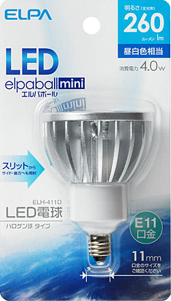 昼白色相当の全光束260ルーメンの「ELH-411D」と、電球色相当の全光束220ルーメンの「ELH-411L」をラインアップ。ともにE11口金で、直径11mmのソケットに対応する。ハロゲン電球に比べ、高温になりにくいことが特徴。やけどの心配や衣料品などの色あせが低減できる。一般家庭のほか、服飾や貴金属、飲食店などでの使用にも適している。