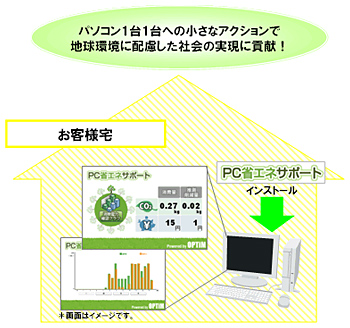 「PC省エネサポート」は、利用しているPCにインストールして、PCの利用実態から節電設定を自動で最適化して消費電力を削減するソフト。削減消費電力量を「CO2排出量」や「円」に換算して、数値やグラフで表示する「見える化機能」を備えている。