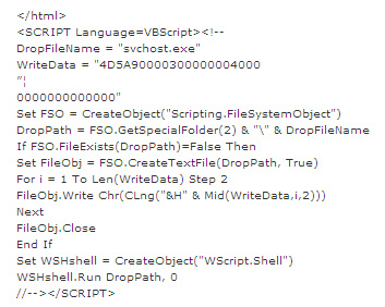 最も単純なのが、HTML感染コード。W32/Ramnitがターゲットマシンで見つけるすべてのHTMLファイルの終わりに、Visual Basic Scriptコードを追加する。