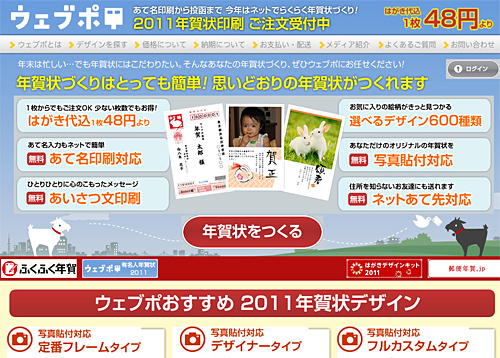 」は、リプレックスと郵便事業が連携して2009年10月にスタートした年賀状のウェブサービス。日本郵便のお年玉付き年賀ハガキを使って、豊富なテンプレートから好みのデザインを選んで裏面を作成し、友人に送ることができる。