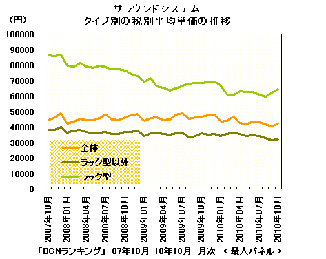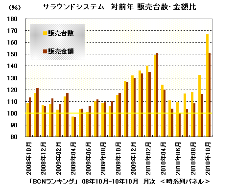10月、サラウンドシステムの対前年同月比は過去2年間(2008年10月-10年10月)で最高値に達した。販売台数は166.9%、販売金額は151.1%だった。12月1日の家電エコポイント制度の改定を目前に控え、薄型テレビを買う人が一緒にサラウンドシステムを購入したからだ。また、9月30日に発売したソニー・コンピュータエンタテインメントのPS3向けモデル「CECH-ZVS1J」が人気を集めたことも、市場全体の成長に貢献した。