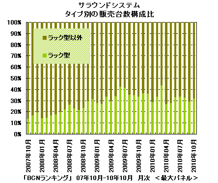 ラック型の販売台数の構成比をみると、07年10月は13.7%だったのが、08年10月は23.3%と徐々に拡大し、09年10月は33.1%、10年10月は31.5%で市場のおよそ3割を占めるようになった。一方、販売金額は、台数と比べると非常に構成比が大きい。07年10月は26.4%、08年10月は38.5%、09年10月は48.6%、10年10月は48.1%で5割近い。