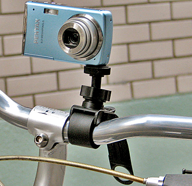 デジカメスタンド「DN-MARM3231」は、自転車のハンドルバーにデジカメを取り付けて、写真や動画がぶれずに撮影できる。直径2.2-4cmまでのハンドルに装着可能。