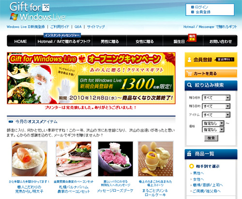 メール de ギフトとマイクロソフトは、メールアドレスがわかれば、住所を知らない友人、知人にプレゼントを贈ることができるサービス「Gift for Windows Live」を開始した。