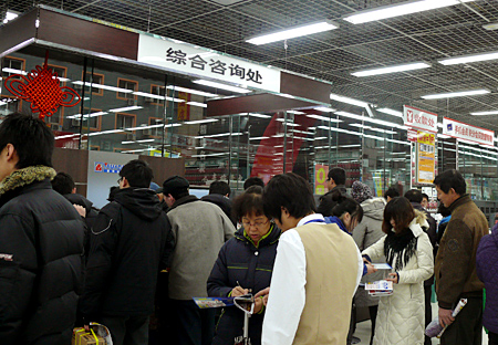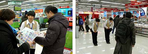 ヤマダ電機は、中国での差異化策として「徹底した接客」を掲げている。それを第1号店の瀋陽店でいかに実現するかが、今後の展開のカギを握っているといっていいだろう。実際に、店内の至る所で来店者が店員に質問を投げかける光景が見られたが、店員はその質問にしっかりと応対。またエレベータ前では、きちんと挨拶をしていた。